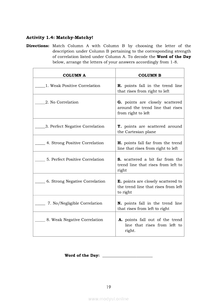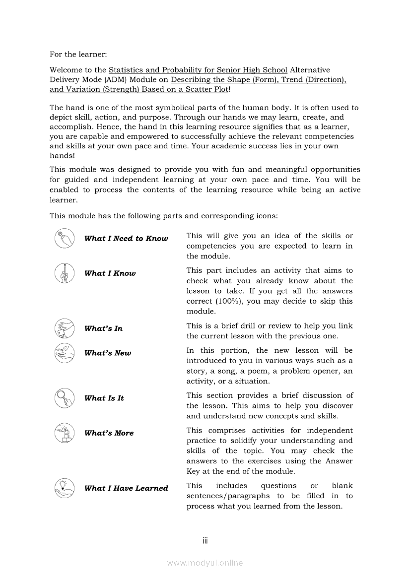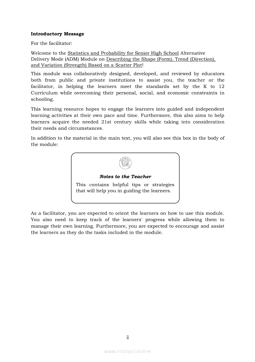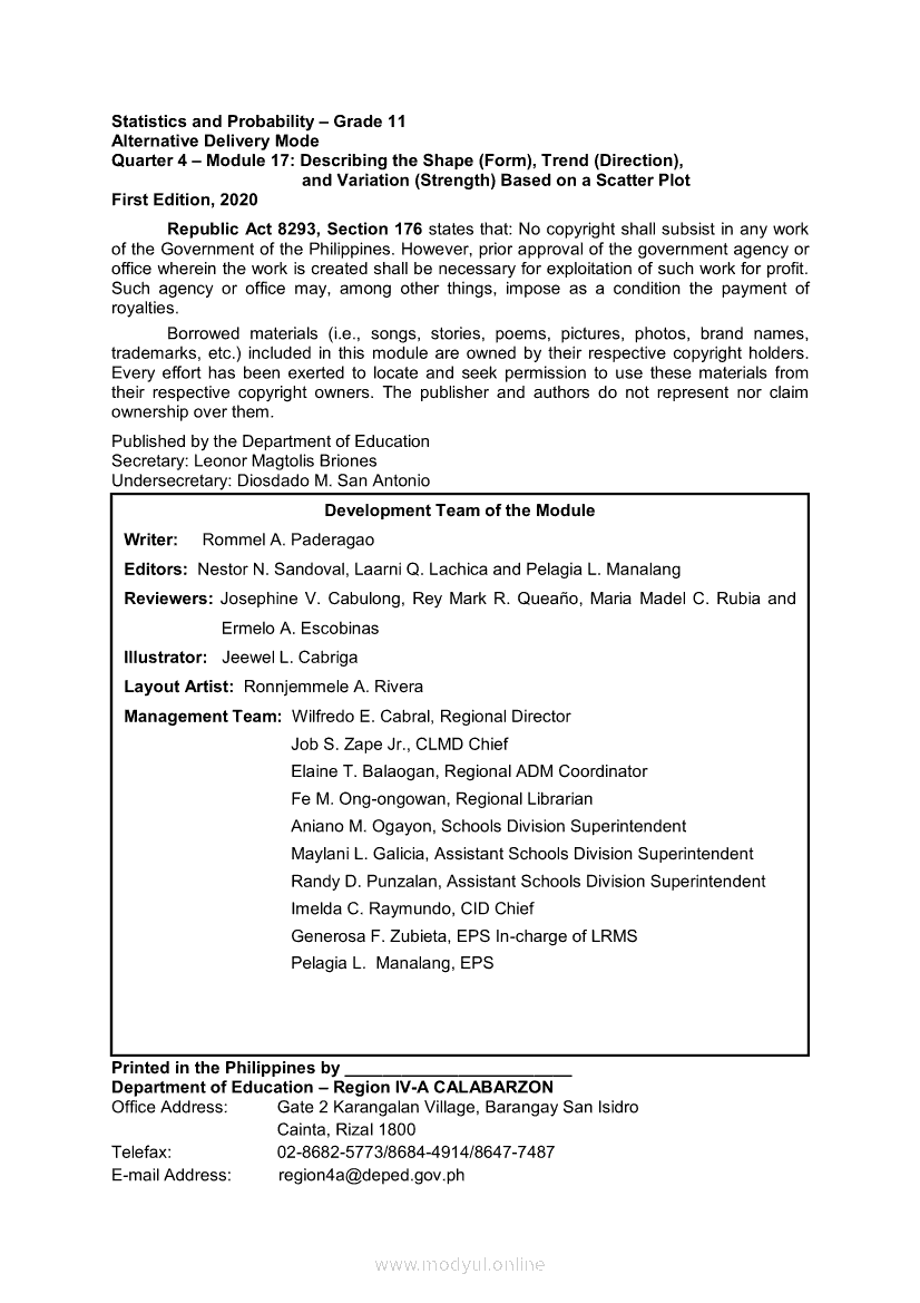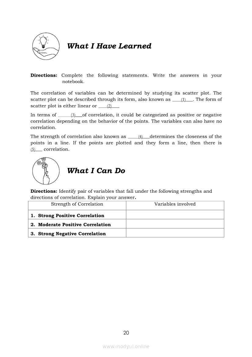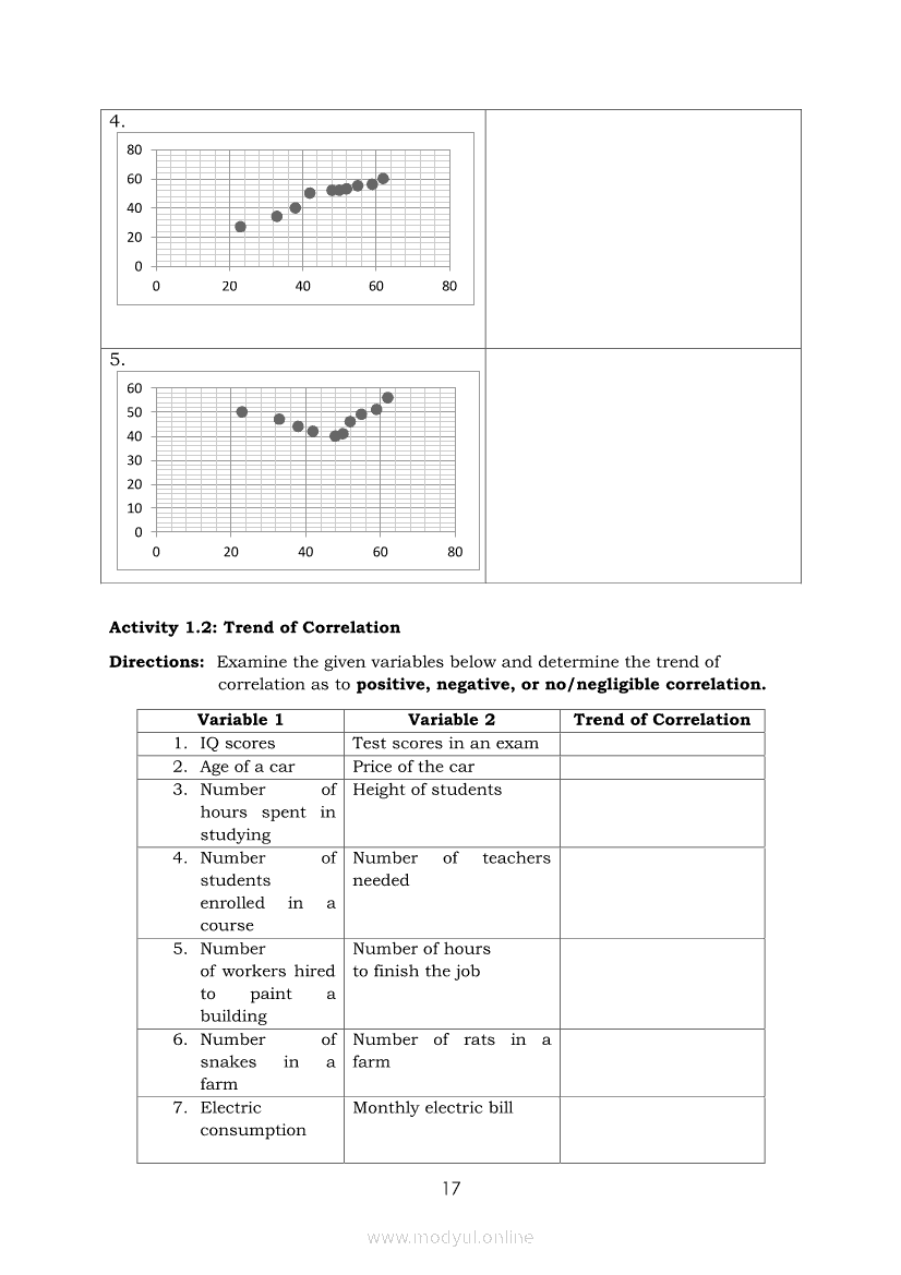 Statistics and Probability Module 17: Describing the Shape (Form), Trend (Direction), and Variation ( Strength) Based on a Scatter PlotApr 22, 2021 SHSGrab your copy of Collegio Advance - ULTIMATE Updated College Entrance Exam Reviewer and pass with flying colors 🎉. Statistics and ProbabilityRelatedStatistics and Probability Module 4: Identifying Appropriate Test Statistics Involving Population MeanStatistics and Probability Module 9: Formulating Appropriate Null and Alternative Hypotheses on a Population ProportionStatistics and Probability Module 7: Drawing Conclusion About Population Mean Based on Test Statistic Value and Critical RegionStatistics and Probability Module 1: Testing HypothesisStatistics and Probability Module 16: Constructing a Scatter Plot