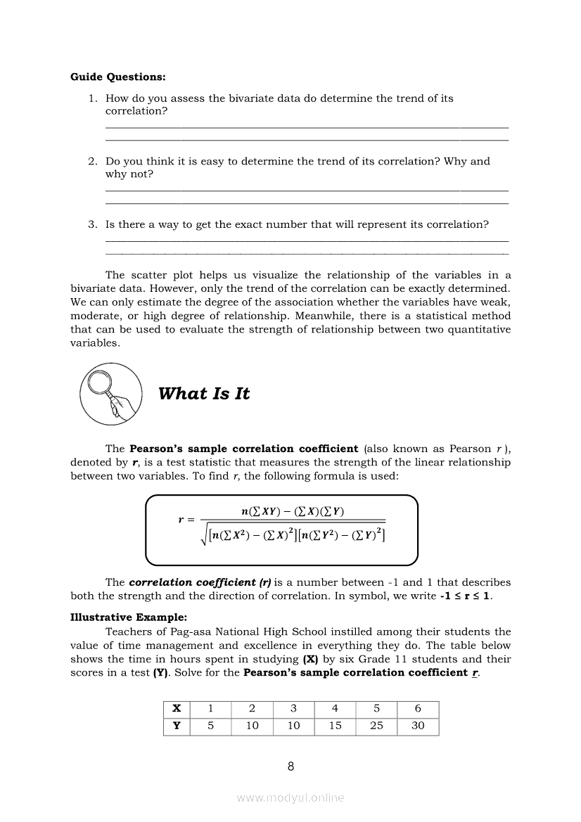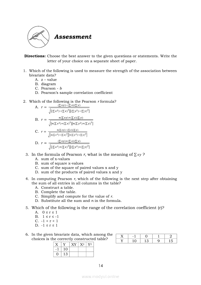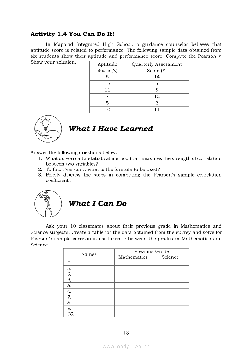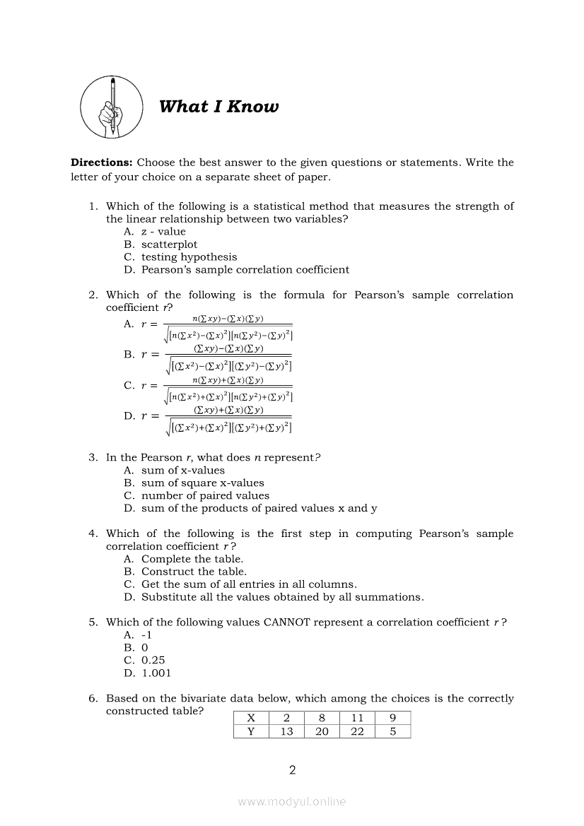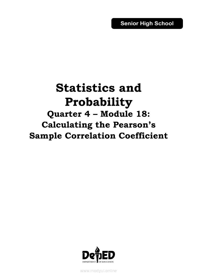 Statistics and Probability Module 18: Calculating the Pearson’s Sample Correlation CoefficientApr 22, 2021 SHSGrab your copy of Collegio Advance - ULTIMATE Updated College Entrance Exam Reviewer and pass with flying colors 🎉. Statistics and ProbabilityRelatedStatistics and Probability Module 1: Testing HypothesisStatistics and Probability Module 9: Formulating Appropriate Null and Alternative Hypotheses on a Population ProportionStatistics and Probability Module 13: Drawing Conclusions About Population Proportion Based on Test Statistic Value and Rejection RegionStatistics and Probability Module 15: Illustrating the Nature of Bivariate DataStatistics and Probability Module 5: Identifying the Appropriate Rejection Region for a Given Level of Significance