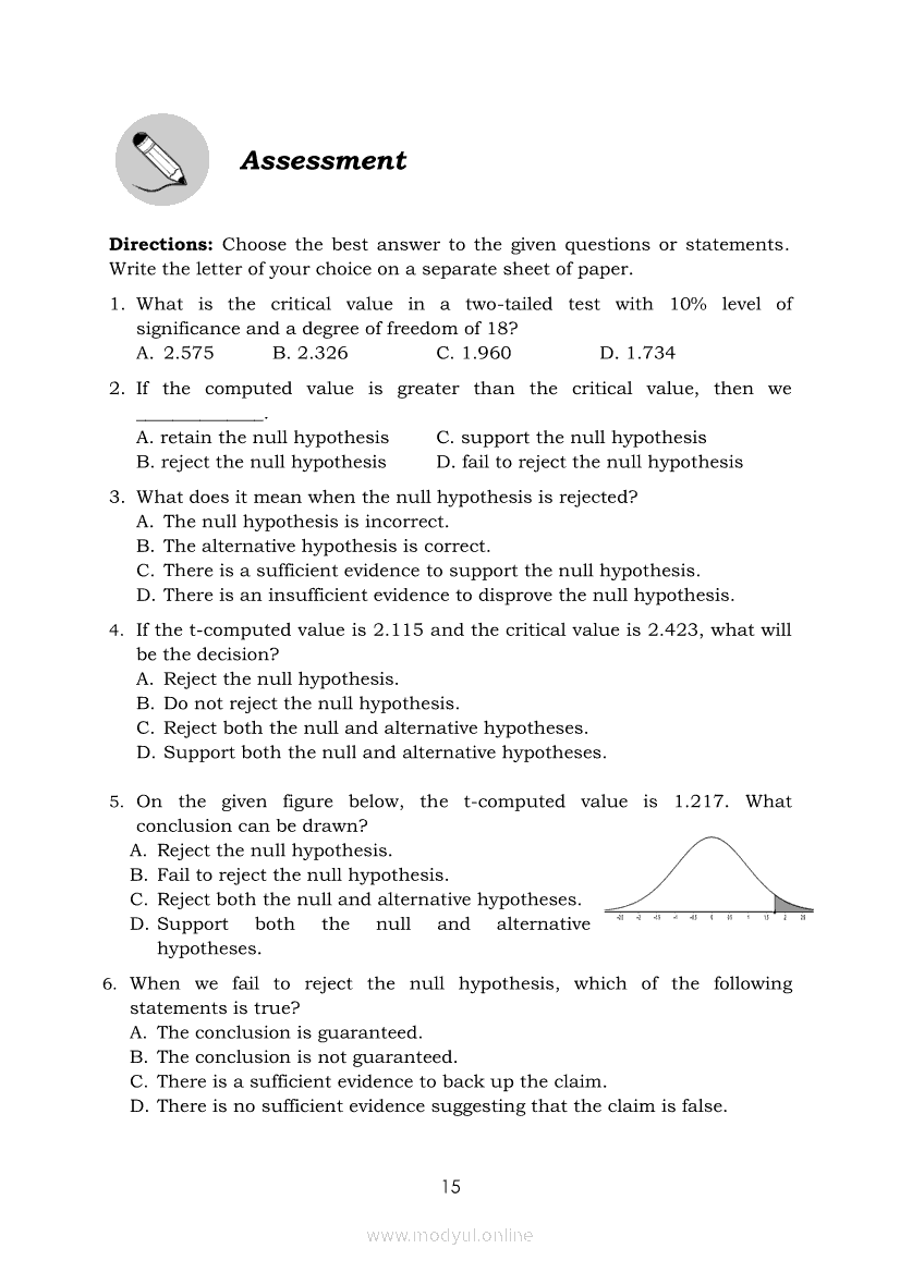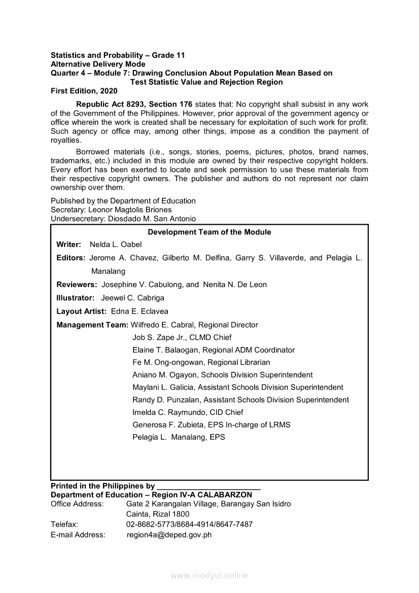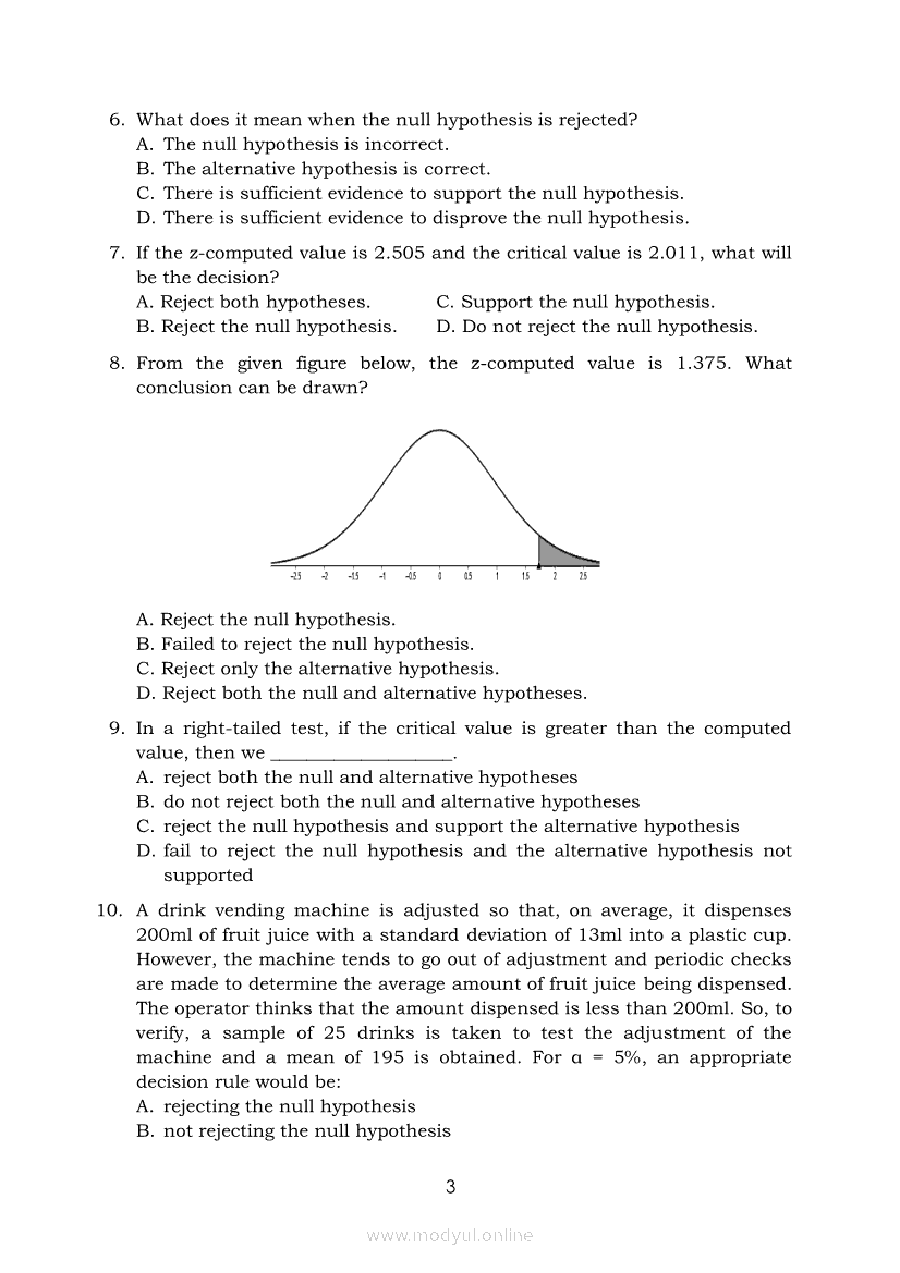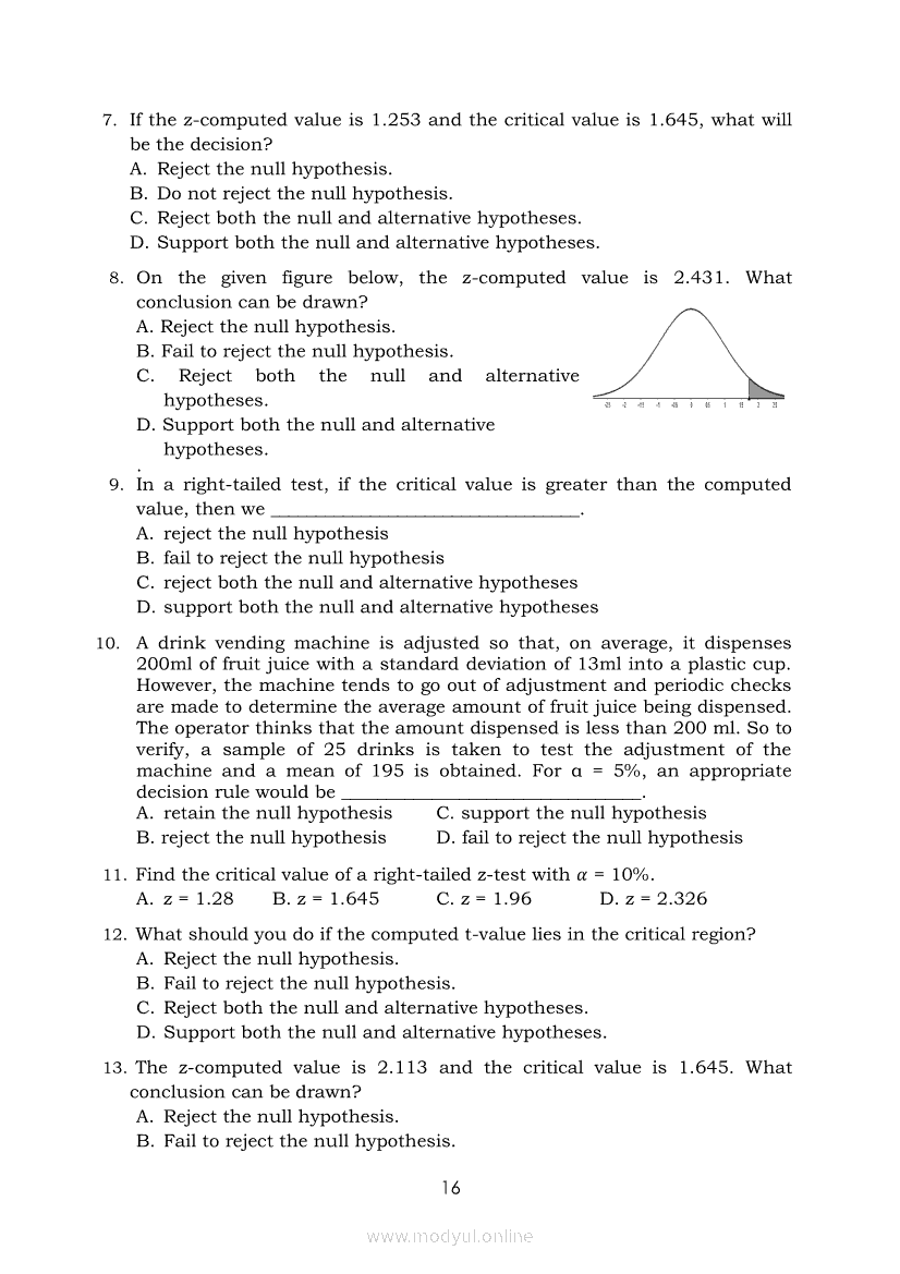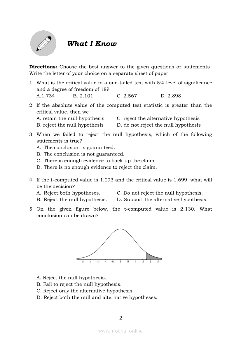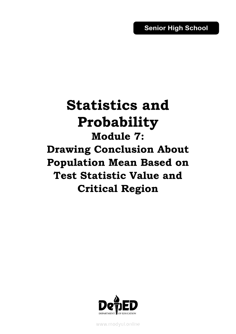 Statistics and Probability Module 7: Drawing Conclusion About Population Mean Based on Test Statistic Value and Critical RegionApr 22, 2021 SHSGrab your copy of Collegio Advance - ULTIMATE Updated College Entrance Exam Reviewer and pass with flying colors 🎉. Statistics and ProbabilityRelatedStatistics and Probability Module 10: Identifying Appropriate Test Statistic Involving Population ProportionStatistics and Probability Module 19: Solving Problems Involving Correlation AnalysisStatistics and Probability Module 20: Identifying Dependent and Independent VariablesStatistics and Probability Module 2: Identifying Parameters for Testing in Given Real-Life ProblemsStatistics and Probability Module 14: Solving Problems Involving Test of Hypothesis on Population Proportion