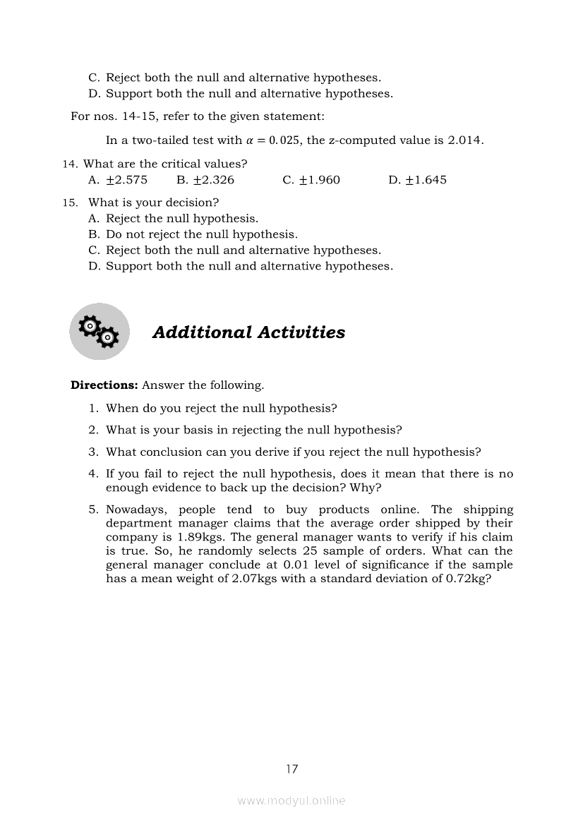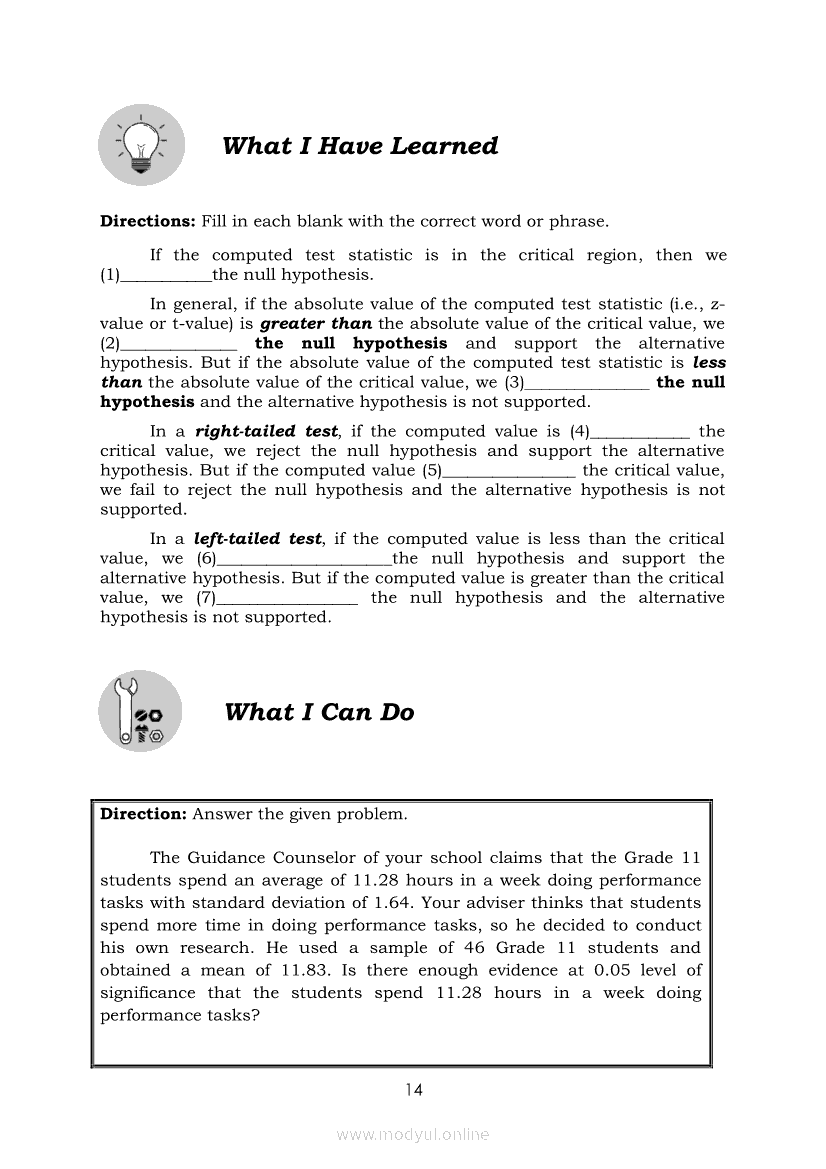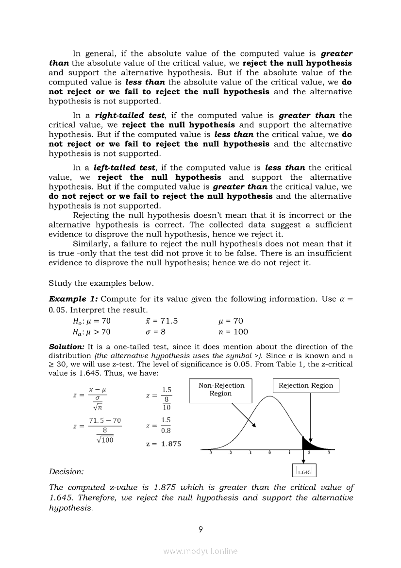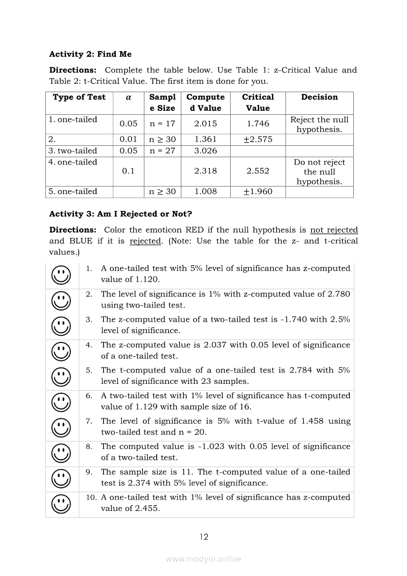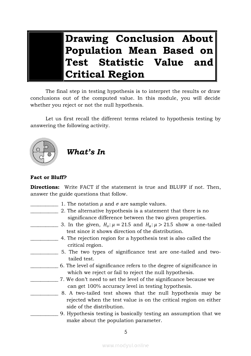 Statistics and Probability Module 7: Drawing Conclusion About Population Mean Based on Test Statistic Value and Critical RegionApr 22, 2021 SHSGrab your copy of Collegio Advance - ULTIMATE Updated College Entrance Exam Reviewer and pass with flying colors 🎉. Statistics and ProbabilityRelatedStatistics and Probability Module 10: Identifying Appropriate Test Statistic Involving Population ProportionStatistics and Probability Module 19: Solving Problems Involving Correlation AnalysisStatistics and Probability Module 20: Identifying Dependent and Independent VariablesStatistics and Probability Module 2: Identifying Parameters for Testing in Given Real-Life ProblemsStatistics and Probability Module 14: Solving Problems Involving Test of Hypothesis on Population Proportion