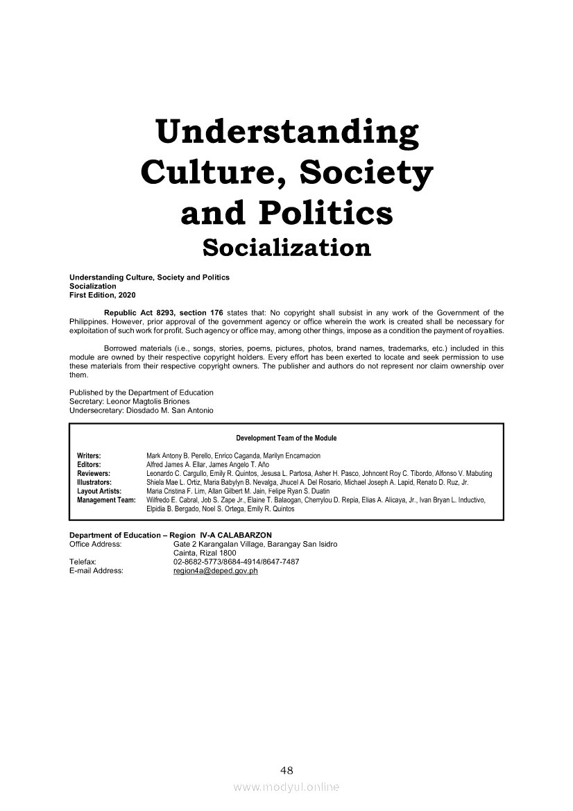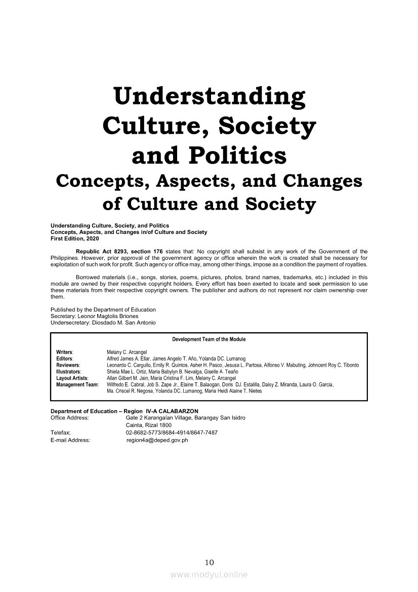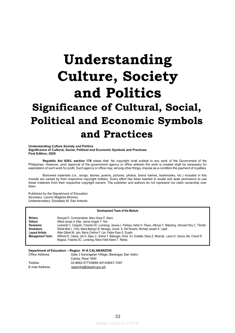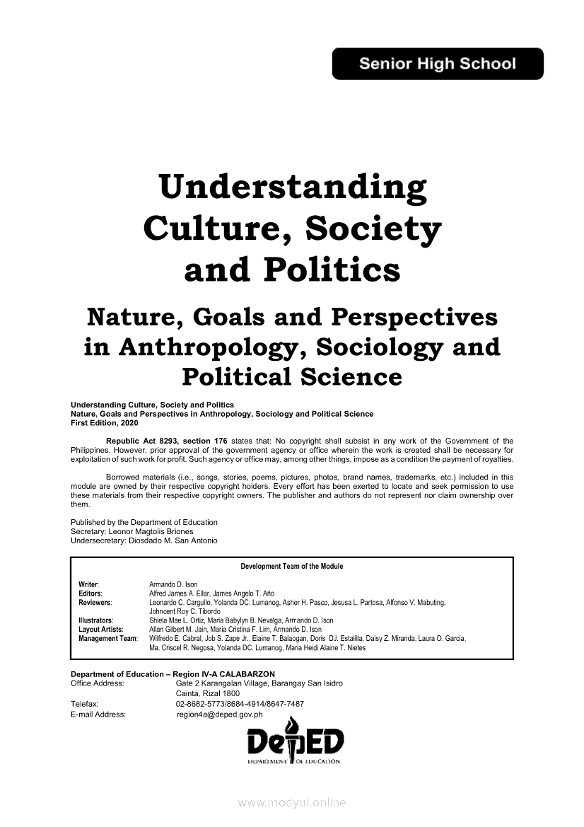 Understanding Culture, Society and Politics (PIVOT)Apr 22, 2021 SHSGrab your copy of Collegio Advance - ULTIMATE Updated College Entrance Exam Reviewer and pass with flying colors 🎉. Understanding Culture, Society and PoliticsRelatedUnderstanding Culture, Society and Politics Quarter 2 – Module 4: Government Programs and Suggestions in addressing Social InequalitiesUnderstanding Culture, Society and Politics Quarter 2 – Module 3: Concept, Characteristics and Forms of Stratification SystemsUnderstanding Culture, Society and Politics Quarter 2 – Module 1: State and Non-State InstitutionsUnderstanding Culture, Society and Politics Quarter 2 – Module 6: New Challenges in Contemporary SocietiesUnderstanding Culture, Society and Politics Quarter 2 – Module 2: Functions and Importance of Education