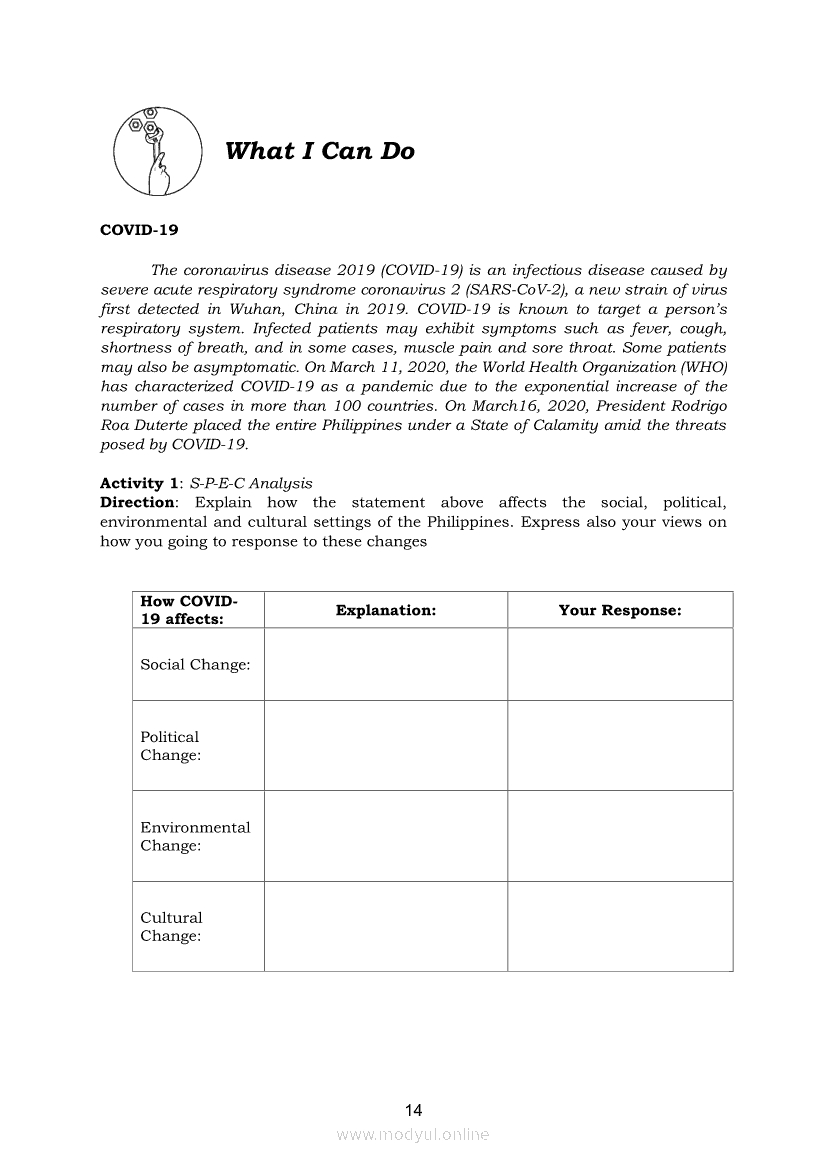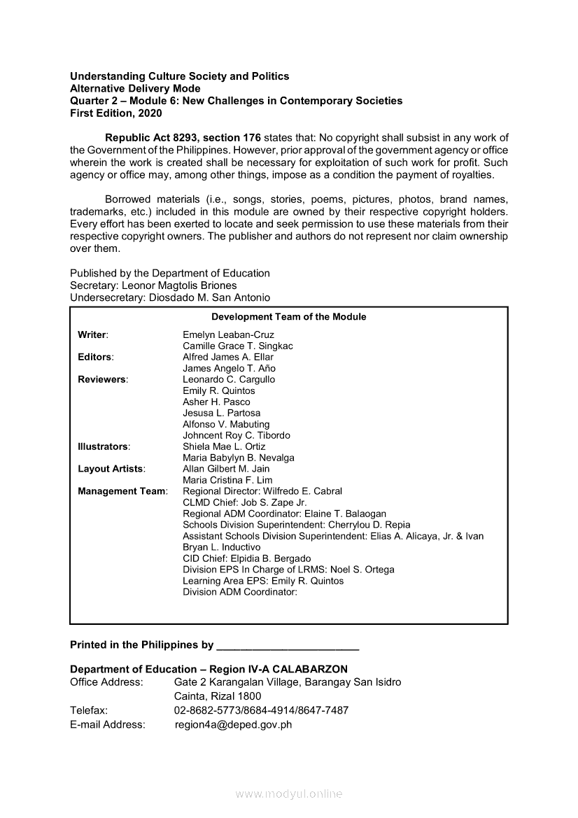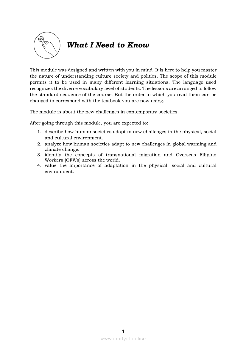 Understanding Culture, Society and Politics Quarter 2 – Module 6: New Challenges in Contemporary SocietiesApr 22, 2021 SHSGrab your copy of Collegio Advance - ULTIMATE Updated College Entrance Exam Reviewer and pass with flying colors 🎉. Understanding Culture, Society and PoliticsRelatedUnderstanding Culture, Society and Politics Quarter 2 – Module 3: Concept, Characteristics and Forms of Stratification SystemsUnderstanding Culture, Society and Politics (PIVOT)Understanding Culture, Society and Politics Quarter 2 – Module 4: Government Programs and Suggestions in addressing Social InequalitiesUnderstanding Culture, Society and Politics Quarter 2 – Module 1: State and Non-State InstitutionsUnderstanding Culture, Society and Politics Quarter 2 – Module 2: Functions and Importance of Education